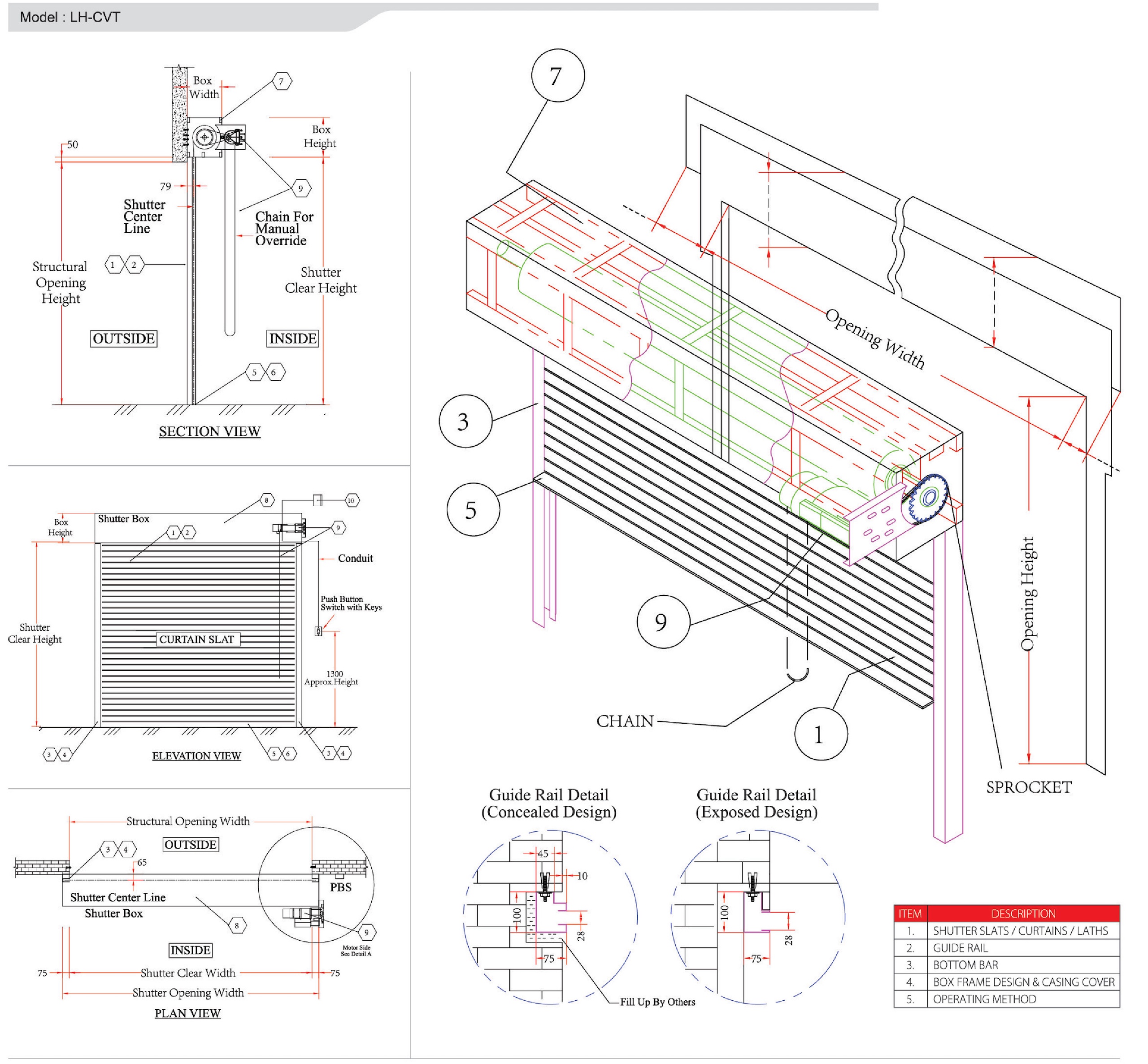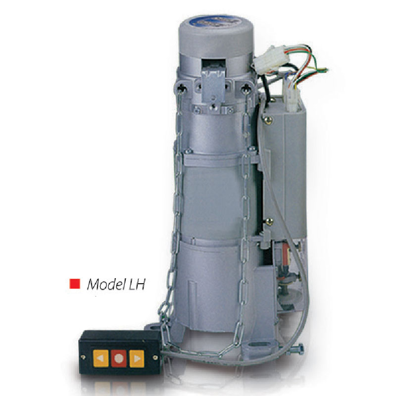 The control for opening and closing of shutters by means of 3 ways push button switch. Each motor is equipped with built in thermal protector, reduction speed gear box, manual override chain when power failure occurs, limit switches for setting upper and lower limit of shutter travel, minimum design of insulation class E, built in release level for gravity close as standard. Power source available in 230v single phase S0Hz and 41 Sv three phase S0Hz. Selection of power source according to manufac-turer standard for various size of shutter door opening width and height.