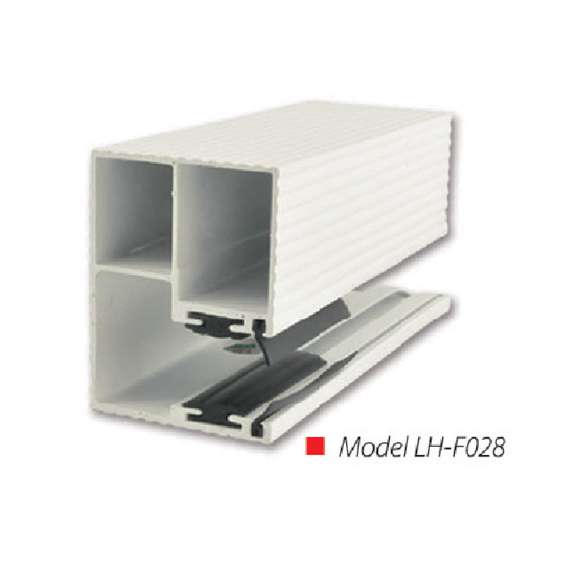 Special design LH-F028 extruded aluminium 6063 TS heavy duty surface mounted guide with Silenser belt and anti-wind design, rush proof, smooth, greaseless and low noise. Material specification extruded aluminium 6063-TS.