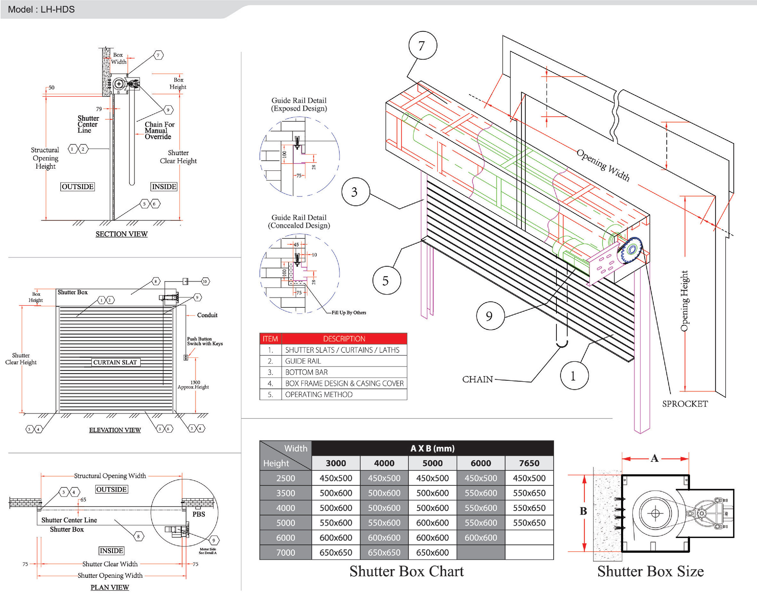 The control for opening and closing of shutters by means of 3 ways push button switch. Each motor is equipped with built in thermal protector, reduction speed gear box, manual override chain when power failure occurs, limit switches for setting upper and lower limit of shutter travel, ensure motor have minimum design of insulation Class E; built in release level for gravity close as standard. Power source available in 230v single phase and 41 Sv three phase S0Hz.