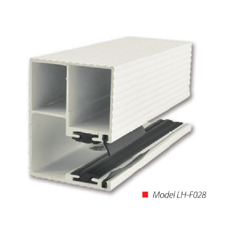Special design LH-F028 extruded aluminium 6063 TS heavy duty surface mounted guide with Silenser belt. Strong and rush proof, greaseless and low noise. Material specification extruded aluminium 6063-TS.