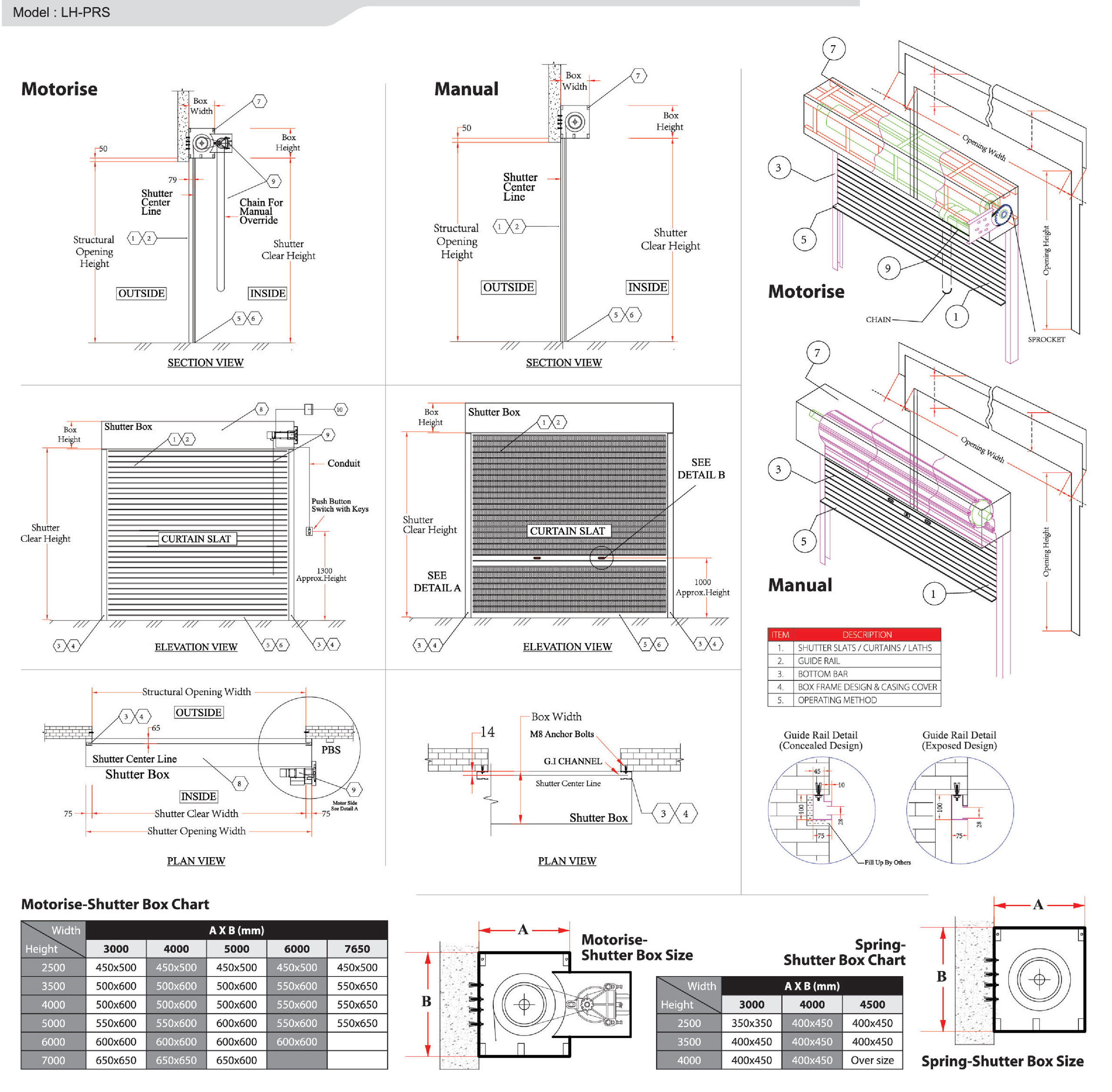 The control for opening and closing of shutters by means of 3 ways push button switch. Each motor is equipped with built in thermal protector, reduction speed gear box, manual override chain when power failure occurs, limit switches for setting upper and lower limit of shutter travel, minimum design of insulation class E, built in release level for gravity close as standard. Power source available in 230v single phase and 41 Sv three phase S0Hz. Selection of power source according to manufacturer standard for various size of shutter door opening width and height.